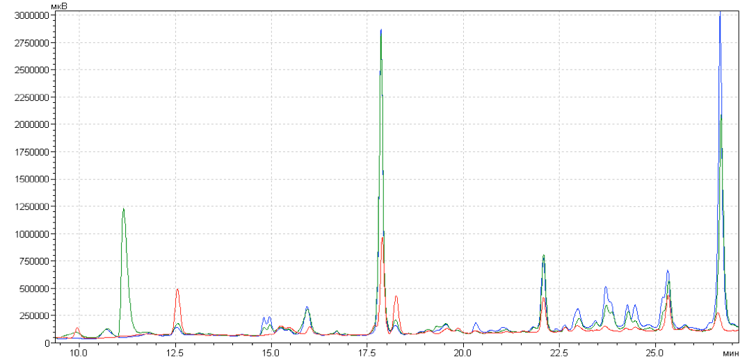 Рис. 3. Хроматограммы В-ПГ экстрактов ромашки зарубежной фирмы №1 (красная), российской фирмы №1 (зелёная) и ЗЭФ (синяя).
