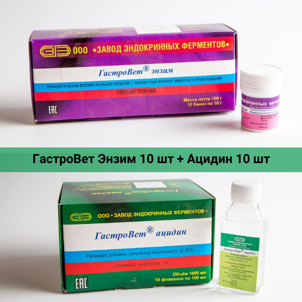 ГастроВет® ацидин - Пищевая добавка, регулятор кислотности (Е 507), соляная кислота 1,0%. ГастроВет® энзим - Соль поваренная пищевая «Экстра», пепсин птичий