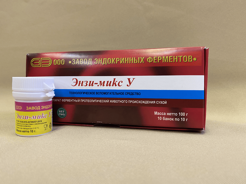ЭНЗИ-МИКС У– энзимный препарат животной природы, содержащий комплекс кислых протеиназ, предназначен для применения в мясной промышленности для обработки мясного сырья. Ферментный состав препарата сбалансирован по степени воздействия на различные белки мяса и мясных систем, применяющихся в технологии получения мясных продуктов. ЭНЗИ-МИКС У работает в мясной системе аналогично внутриклеточным ферментам (катепсинам). Он является их синергистом и обладает дополнительными качествами, которые позволяют ему воздействовать в более широком диапазоне технологических параметров, а также влиять на те белковые системы, на которые внутриклеточные ферменты не действуют или оказывают действие в незначительной степени.