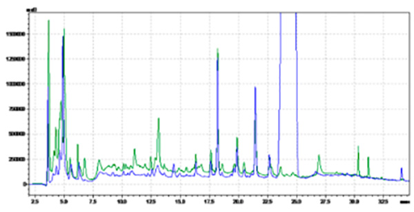 Рис. 3. Хроматограммы экстрактов Calendula officinalis L. при извлечении одним растворителем из сырья разных сортов. Синий – водно-пропиленгликолевый («Завод эндокринных ферментов», Россия), зеленый – водно-пропиленгликолевый (латвийская фирма).