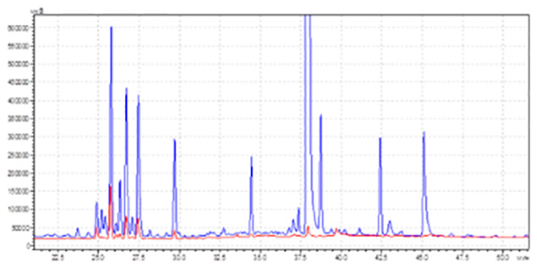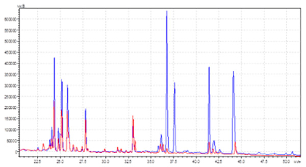 Рис. 4. Хроматограммы экстрактов женьшеня (Panax ginseng C. A. M.), произведенных на разных предприятиях: синие – воднопропиленгликолевые («Завод эндокринных ферментов», Россия), красные воднопроприленгликолевые двух компаний стран ЕС