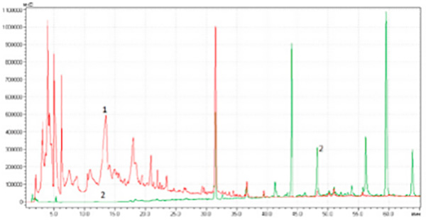 На рис. 3 представлены хроматограммы экстрактивных соединений календулы (Calendula officinalis L.), произведенных на российском и латвийском предприятиях. Качество экстрактов сопоставимое, при этом каждый экстракт имеет преимущество по одним компонентам и проигрывает по другим.