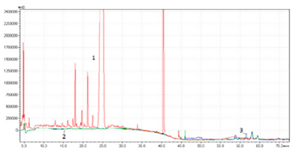Рис. 2. Хроматограммы экстрактов Calendula officinalis L.: 1 – водно-пропиленгликолевого («Завод эндокринных ферментов», Россия), 2 – масляного экстракта («Завод эндокринных ферментов», Россия), 3 – масляного экстракта производства Германии.