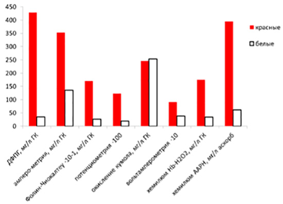 Рис. 5. Средние показатели содержания АО в винах, получаемые при использовании различных тест-систем. ГК – галловая кислота (стандарт сравнения), аскорб – аскорбиновая кислота (стандарт сравнения), хемилюм – хемилюминесцентный метод (инициирование с помощью системы «гемоглобин – H2O2» либо с помощью азоинициатора AAPH).